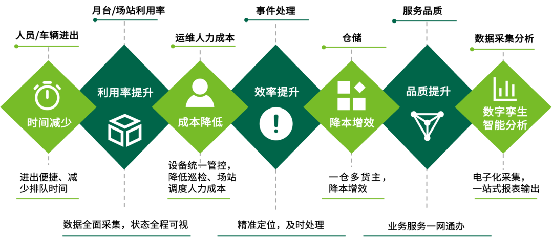 白皮書提出,智慧物流園區(qū)的建設(shè)將助力園區(qū)提質(zhì)降本增效,總體提升園區(qū)運營管理效率和綜合服務(wù)質(zhì)量,促進園區(qū)產(chǎn)業(yè)高能級發(fā)展,從而實現(xiàn)園區(qū)高質(zhì)量發(fā)展。這一價值體現(xiàn)在人員/車輛進出效率提升、月臺/場站利用效率提升、運維人力成本降低、事件處理效率提升、倉儲降本增效、服務(wù)品質(zhì)提升、數(shù)據(jù)采集分析效率提升等方方面面。