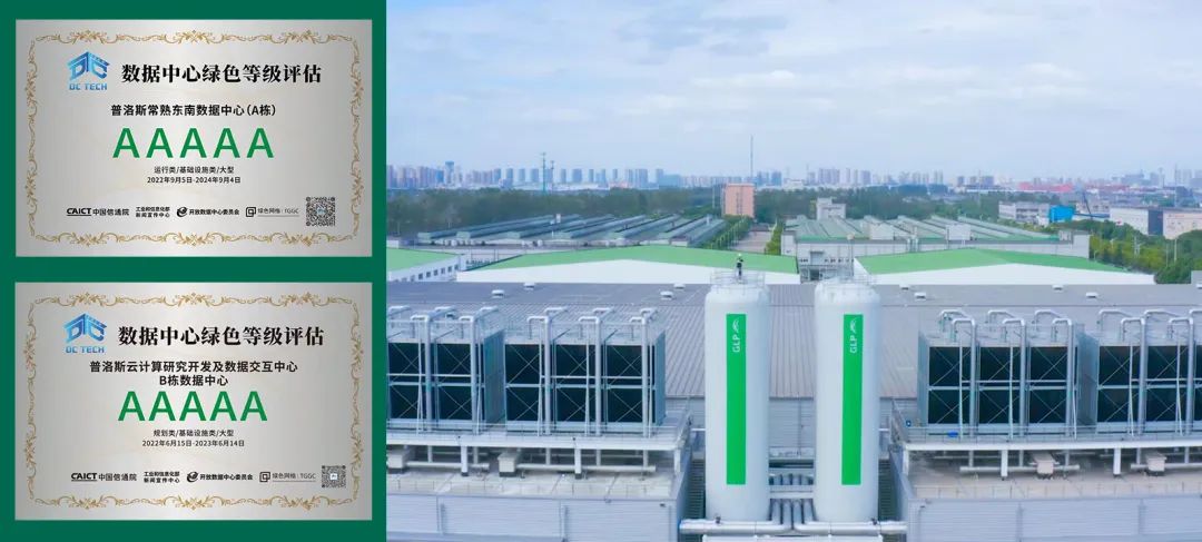 普洛斯數據中心已取得多項“數據中心綠色等級評估”體系內最高等級的5A級認證,其中普洛斯常熟東南數據中心榮獲“數據中心綠色等級評估”5A級規劃類認證及5A級運營類認證,摘得雙5A認證。