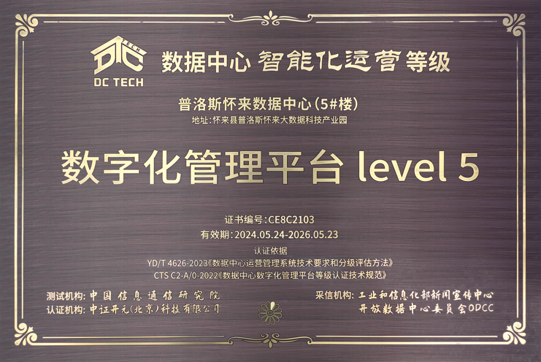 7月9日,普洛斯懷來數據中心5號樓通過“DC Tech數據中心智能化運營等級評估”,獲得數據中心智能化運營等級數字化管理平臺level 5等級認證,為該評估體系的最高等級。該認證進一步體現了普洛斯數據中心業內領先的運營管理水平,以及普洛斯懷來數據中心的行業領先性。