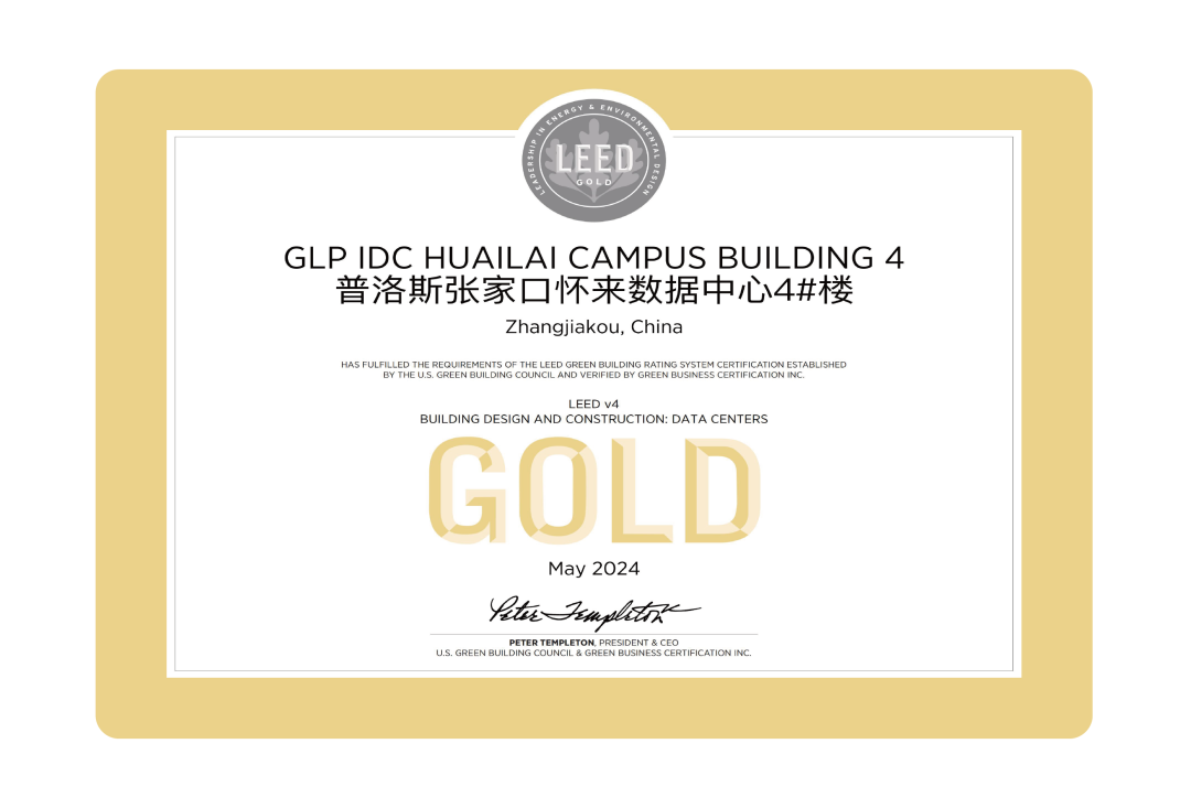 普洛斯懷來數據中心4號樓獲得美國綠色建筑評估標準體系LEED v4 BD+C(建筑設計與建造)金級認證